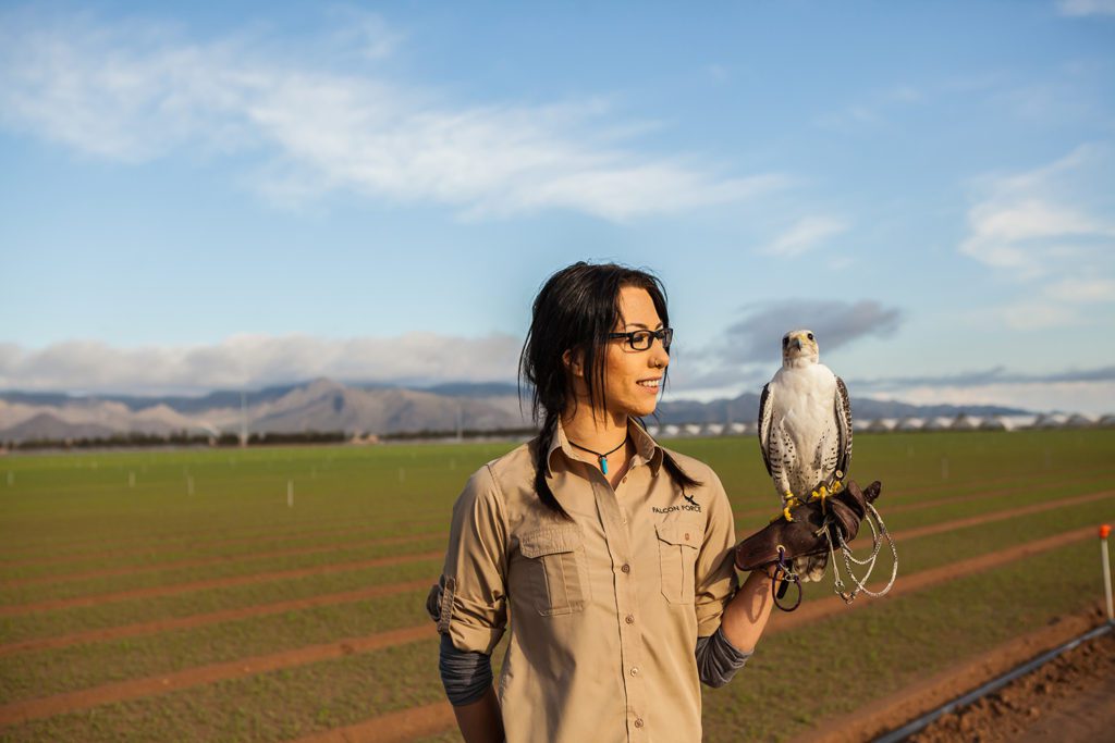 การใช้เหยี่ยวในฟาร์มเกษตร โดยเฉพาะฟาร์มอินทรีย์ (organic farm) กำลังเป็นที่สนใจมากขึ้น เพราะเป็นวิธีธรรมชาติสอดคล้องกับแนวคิดการเกษตรยั่งยืน ตัวอย่างเช่น ฟาร์มผักอินทรีย์ Duncan Family Farms ในรัฐแอริโซนาของสหรัฐฯ ได้ว่าจ้างทีมเหยี่ยวจากบริษัท Falcon Force มาปฏิบัติการไล่นกแทนการใช้วิธีเดิมอย่างประทัดหรือเครื่องไล่นกแบบเก่า ซึ่งฟาร์มพบว่าวิธีเหยี่ยวนี้ได้ผลกว่าและลดผลกระทบด้านลบต่อสิ่งแวดล้อมลงอย่างมากหยี่ยวที่บินโฉบอยู่เหนือแปลงเพาะปลูกจะทำให้นกเล็กนกใหญ่ตกใจหนีไปหาที่หากินอื่น เมื่อใดที่นกศัตรูเห็นนักล่าตามธรรมชาติบินวนเวียนอยู่ใกล้ ๆ มันก็มักจะรีบหนีไปหาที่ปลอดภัยกว่าด้วยเหตุนี้ นกที่เคยคุ้นชินกับวิธีไล่แบบเก่า ๆ (เช่น เสียงคนไล่หรือเสียงประทัด) ซึ่งอาจกลับมาใหม่หลังเสียงเงียบไป จะไม่กล้าอยู่ในพื้นที่ที่มีเหยี่ยวเลย นอกจากนี้การใช้เหยี่ยวยังมีข้อดีเพิ่มเติม เช่น เหยี่ยวหนึ่งตัวสามารถลาดตระเวนพื้นที่การเกษตรกว้างใหญ่ได้อย่างมีประสิทธิภาพ ลดความจำเป็นที่คนงานจะต้องเดินไล่นกเองซึ่งทั้งไม่ทั่วถึงและอาจเสี่ยงอันตราย (เช่น การเดินในแปลงเกษตรที่เปียกลื่นหรือมีสัตว์มีพิษ)