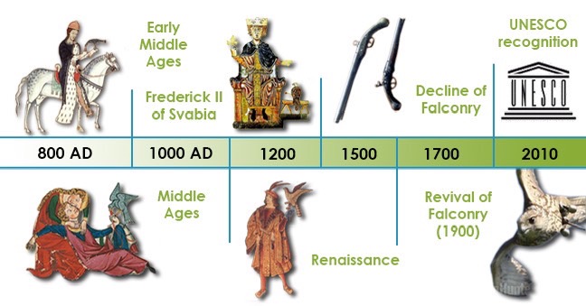 หลักฐานทางประวัติศาสตร์และโบราณคดี – การฝึกนกล่าเหยื่อ (หรือที่เรียกรวมว่า การล่าเหยี่ยว, falconry) มีประวัติยาวนานกว่า 4,000 ปี แต่อาจเริ่มขึ้นก่อนมีบันทึกเป็นลายลักษณ์อักษรด้วยซ้ำ นักประวัติศาสตร์สันนิษฐานว่ากิจกรรมนี้ถือกำเนิดขึ้นในภูมิภาคเอเชียกลางและที่ราบสูงอิหร่าน แล้วเผยแพร่ไปยังดินแดนอื่นผ่านเส้นทางสายไหมและการค้าระหว่างชนชาติต่าง ๆหลักฐานที่เก่าแก่ที่สุดคือเศษภาชนะดินเผายุคโบราณ (ประมาณ 3,000 ปีก่อนคริสต์ศักราช) จากแหล่งโบราณคดี นอกจากนี้ยังพบภาพแกะสลักหินของนักล่าเหยี่ยวสมัยโบราณ (ราว 1,000 ปีก่อนคริสต์ศักราช) ในเทือกเขาอัลไตของมองโกเลียและจีนตะวันตก ภายในช่วงต้นยุคกลาง การล่าเหยี่ยวได้แพร่หลายไปยังหลายส่วนของโลก ดังปรากฏภาพจิตรกรรมฝาผนังในสุสานจีนสมัยราชวงศ์ถัง (ค.ศ. 618–907) ที่บรรยายฉากการล่าเหยี่ยวอย่างชัดเจน